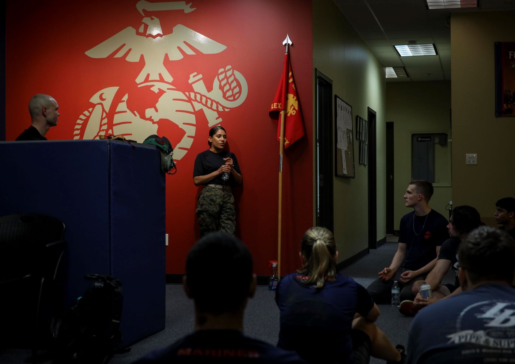 Pfc. Yessica Mendozacorona speaks with poolees at Recruiting Sub Station Lexington, as part of the Command Recruiting Program (CDR), Lexington, South Carolina. (U.S. Marine Corps photo by Cpl. Dylan Walters)