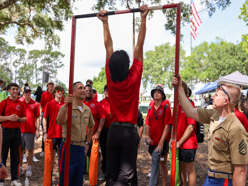 A Vero Beach High School student attempts the Marine Corps pull up bar challenge during the Lakeside Jazz Festival held at Port Orange, Florida. (U.S. Marine Corps photo by Lance Cpl. Kevin Lopez Herrera)